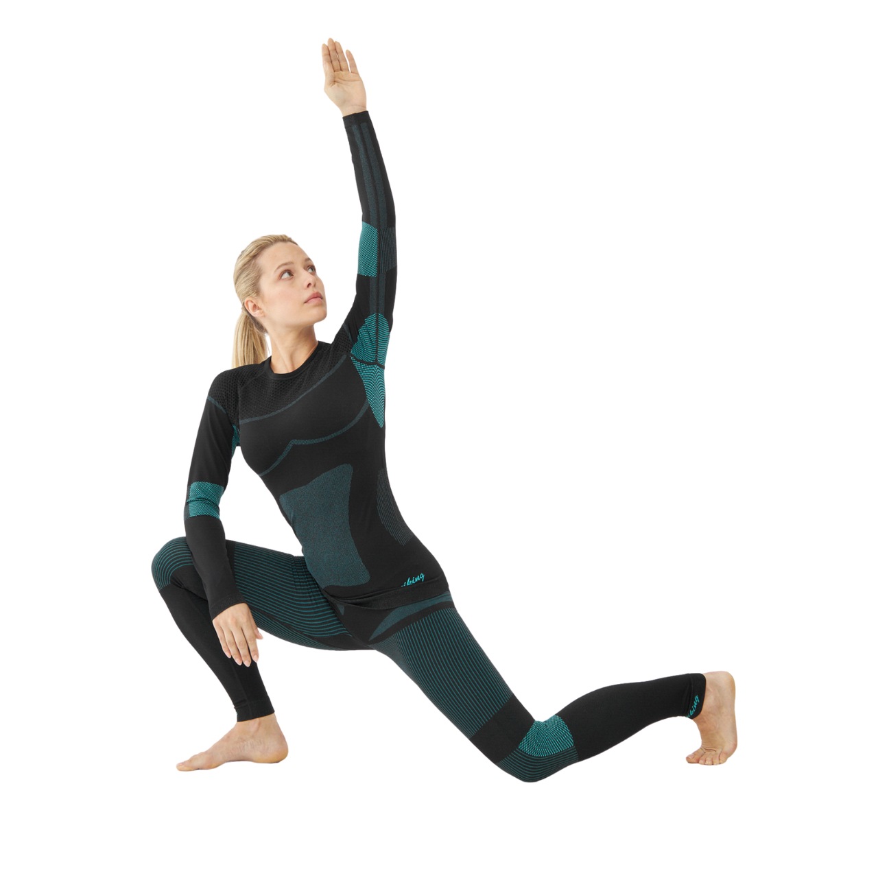 Bielizna termoaktywna damska Viking Ilsa, to bezszwowa, elastyczna konstrukcja, która dopasowuje się do ciała, pozostawiając pełną mobilność bez otarć i ucisku. Kompresyjny krój koszulki z długim rękawem i długich spodni, idealnie przylega do ciała. Szybkoschnący, oddychający materiał. Antybakteryjne i antyalergiczne właściwości. Wzmocnione strefy. Czarno-zielony model.