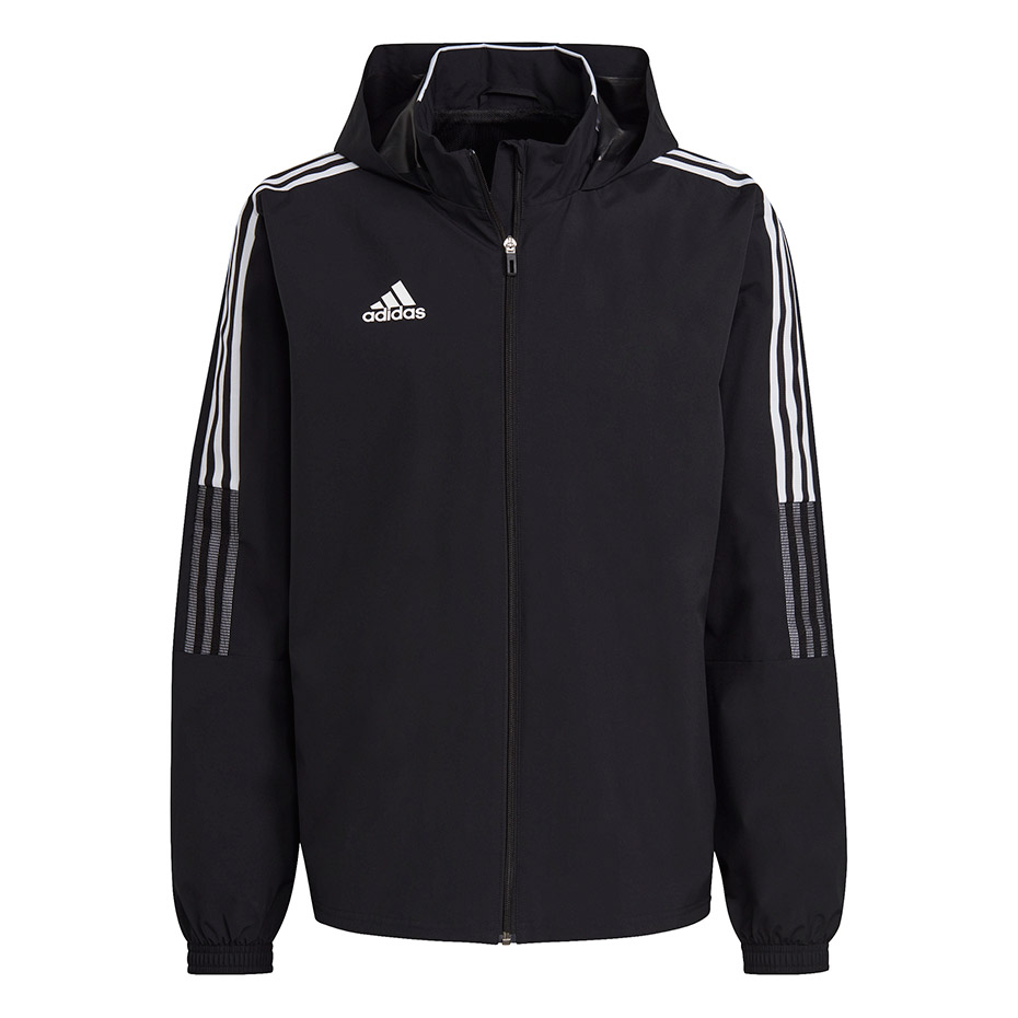 Męska bluza adidas Tiro 21 w kolorze czarnym z białymi detalami. Produkt sprawdzi się w różnych warunkach pogodowych. Zintegrowany kaptur ochroni głowę przed deszczem i wiatrem. Siateczkowa podszewka odpowiada za wentylację ciała. Konstrukcja wykonana z gładkiej tkaniny wykazującej właściwości wodoodporne. Boczne kieszenie zapinane na zamek błyskawiczny. Zamek na całej długości. Ściągacze u dołu i na mankietach.