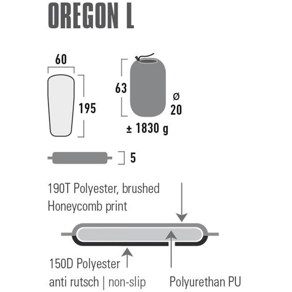 Samopompująca się mata termiczna z pianką o wysokiej gęstości zapewnia izolację i komfort. Powierzchnia „Wave Cut” idealnie przylega do ciała. Mata samopompująca wykonana jest z wysokiej jakości, antypoślizgowej szczotkowanej tkaniny poliestrowej. Spód wykonany jest z wytrzymałego poliestru antypoślizgowego. Samopompująca mata Oregon jest wyposażona w zawór zwrotny. Mata jest wyposażona w 2 paski kompresyjne i worek.