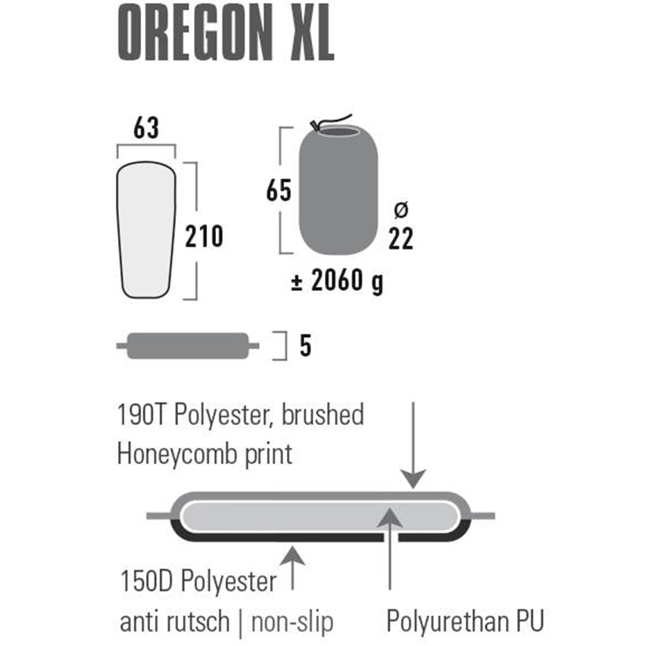 Samopompująca się mata termiczna z pianką o wysokiej gęstości zapewnia izolację i komfort. Powierzchnia „Wave Cut” idealnie przylega do ciała. Mata samopompująca wykonana jest z wysokiej jakości, antypoślizgowej szczotkowanej tkaniny poliestrowej. Spód wykonany jest z wytrzymałego poliestru antypoślizgowego. Samopompująca mata Oregon jest wyposażona w zawór zwrotny. Mata jest wyposażona w 2 paski kompresyjne i worek.