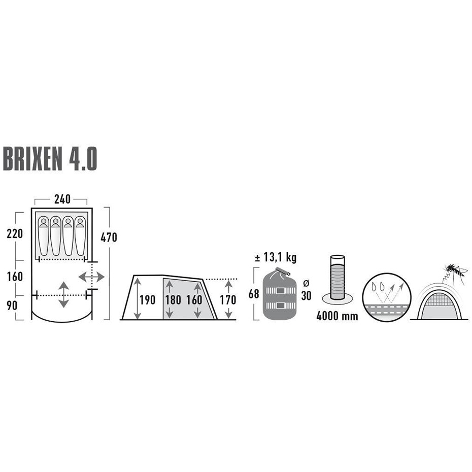 Namiot High Peak Brixen 4.0 to idealna propozycja dla osób, które wybierając się na biwak w większym gronie. Konstrukcja z sypialnią przeznaczoną dla 4 osób. Laminowanie szwy i wodoodporność na poziomie 4000 mm słupa wody. Duży przedsionek oraz korytarz z oknem. Moskitiera chroniąca przed owadami. Kieszonki wewnątrz pozwalające na przechowywanie podręcznych drobiazgów. Pętelka na zawieszenie lampy. Otwory wentylacyjne. Specjalne miejsce do poprowadzenia przedłużacza.