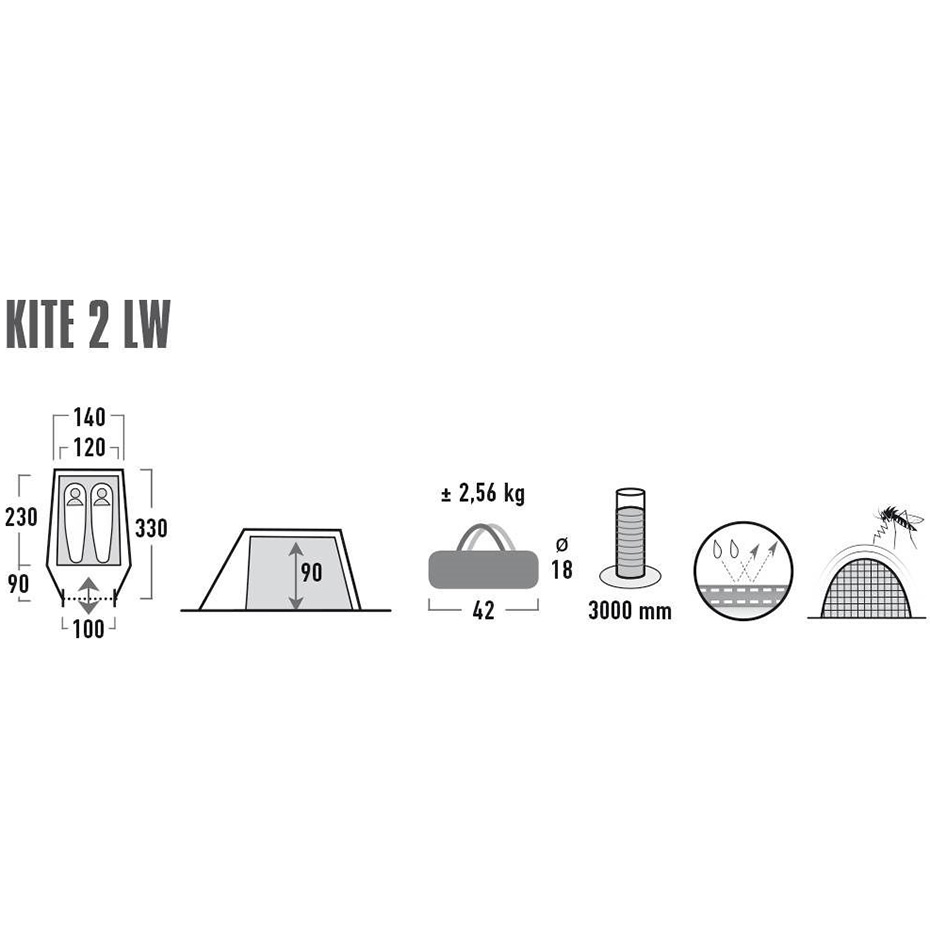 Przestronny namiot High Peak Kite 2 przeznaczony dla dwóch osób. Otwory wentylacyjne. Przedsionek do wykorzystania jako kuchnia czy pomieszczenie gospodarcze. Wejście wyposażone jest w moskitiery. Szwy laminowane i wodoodporność 3000mm słupa wody. Niewielka waga i wielkość opakowania zwiększają komfort użytkowania. Duże wejście "Easy Stow Away"