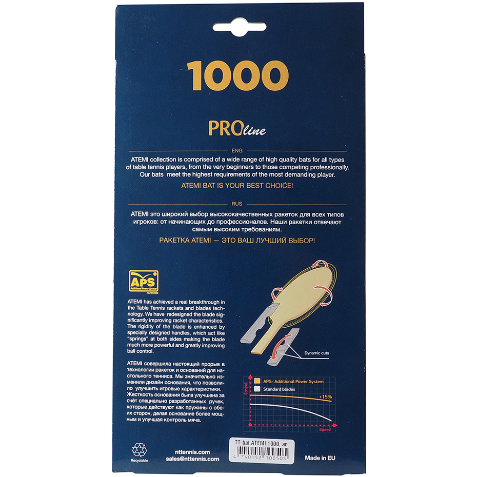 Rakietka do ping ponga New Atemi 1000 Pro pozwoli Ci wyprowadzić szybki i kontrolowany atak, który przyniesie zwycięskie punkty. Wyważony korpus APS został wykonany z egzotycznego drewna, które gwarantuje wytrzymałość i lekkość podczas częstych rozgrywek. Uchwyt typu concave. Gumowa okładzina osadzona na amortyzującej piance. Estetyczny projekt z subtelnymi emblematami, nawiązującymi do tradycji marki. Wysokiej jakości model do rekreacyjnych rozgrywek i profesjonalnych meczów.