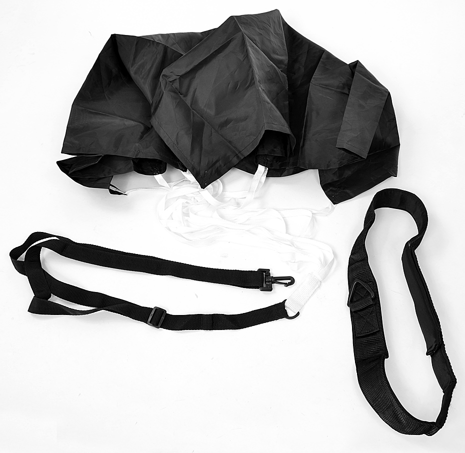 Spadochron treningowy (winylowy) z regulowanym pasem doskonale sprawdzi się w różnych dyscyplinach. To efektywne narzędzie w treningu wytrzymałościowym. Świetnie wpływa na mięśnie nóg. Średnica spadochronu: ok. 1m. Regulowany pas i zapięcie.