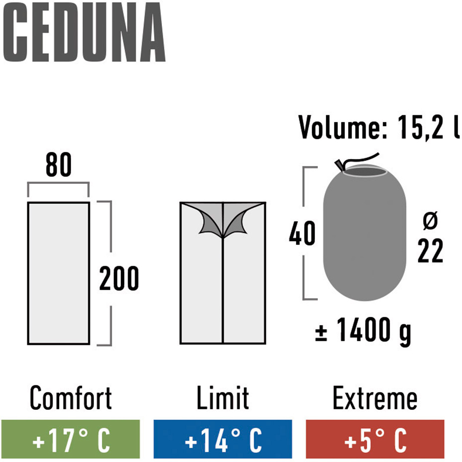 Wysokiej jakości śpiwór Ceduna marki High Peak to doskonały wybór na biwak. Model może służyć również jako kołdra. Dzięki niewielkiej wadze niekłopotliwy podczas transportu. Idealny na lato, wiosnę i jesień. Warstwa zewnętrzna została zaimpregnowana w technologii Bionic-Finish Eco (przyjazna dla środowiska technologia hydrofobowa zwiększająca odporność na zabrudzenia i uszkodzenia mechaniczne). Wnętrze śpiwora miłe dla skóry. Wypełnienie Dura Loft H1 z kolei posiada duże właściwości izolacyjne i schnące. Dwa identyczne śpiwory z przeciwległymi zamkami można spiąć i wykorzystać jako podwójny śpiwór. Model ma wewnętrzną kieszeń. Maksymalny wzrost użytkownika 190 cm. Pokrowiec w zestawie.